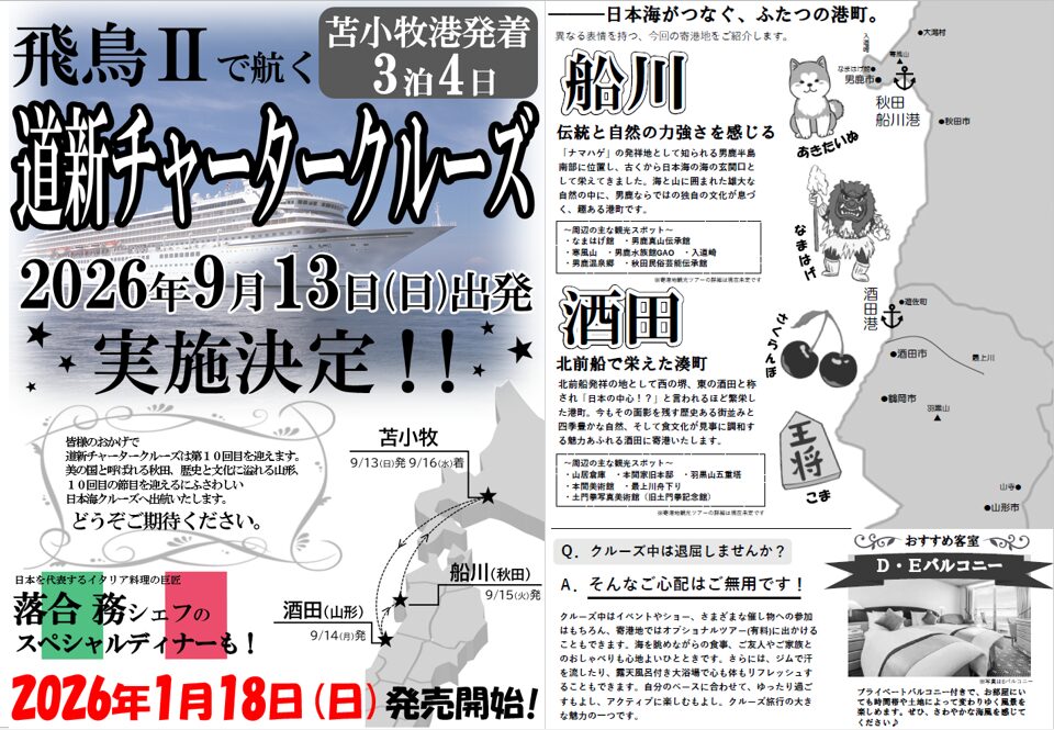 飛鳥Ⅱ 2026年道新チャータークルーズ ※パンフレットの完成は12月中旬を予定しております。 資料請求・お問い合わせ お電話でのお問い合わせ 011-241-6401 月~金曜日 10:00~12:00/13:00~17:00 ●12:00~13:00は昼休業●店頭:午前営業は11:45受付終了(土・日・祝休業) メールアドレスinfo@doshin-sc.co.jp ※パンフレットの発送は12月中旬を予定しております。 お申し込みはこちら 資料請求はこちら