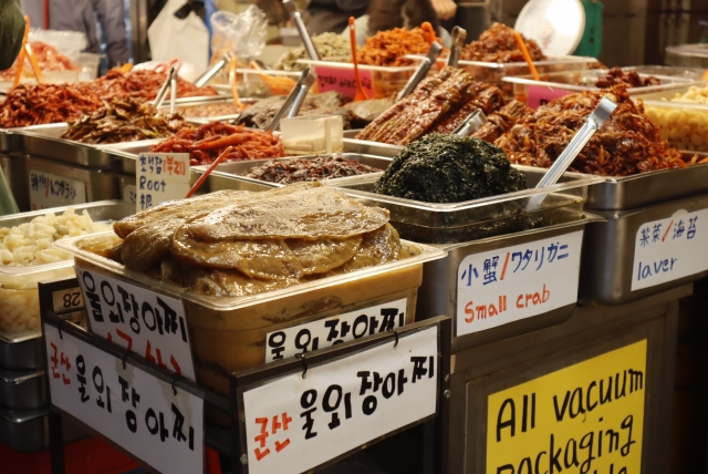 ⑤カンジャンケジャン ワタリガニを醤油だれに漬けた伝統料理。『ご飯泥棒』(ご飯がすすむおかず)とも言われる。